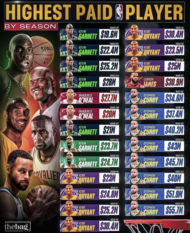 美国体育媒体TheBag发布了《2000–01至2024–25赛季NBA各赛季最高薪球员》榜单:上榜者依次经历加内特、奥尼尔、科比、詹姆斯到库里等代表人物,其中科比在2009–2016多次居首,库里自2017–18起连续领跑至今。