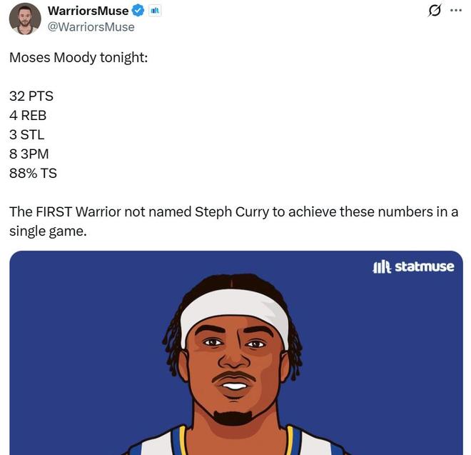凭借这样的表现,穆迪成为库里之外勇士队史第二位能够单场交出至少32分4篮板3抢断8记三分,且真实命中率88%的球员。